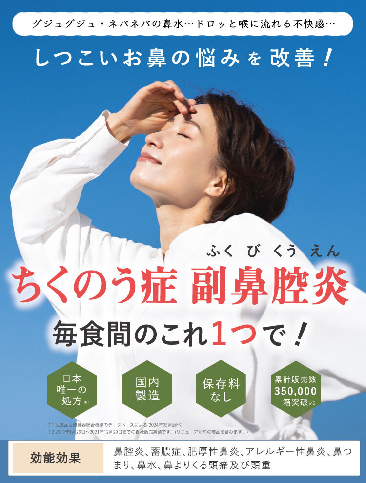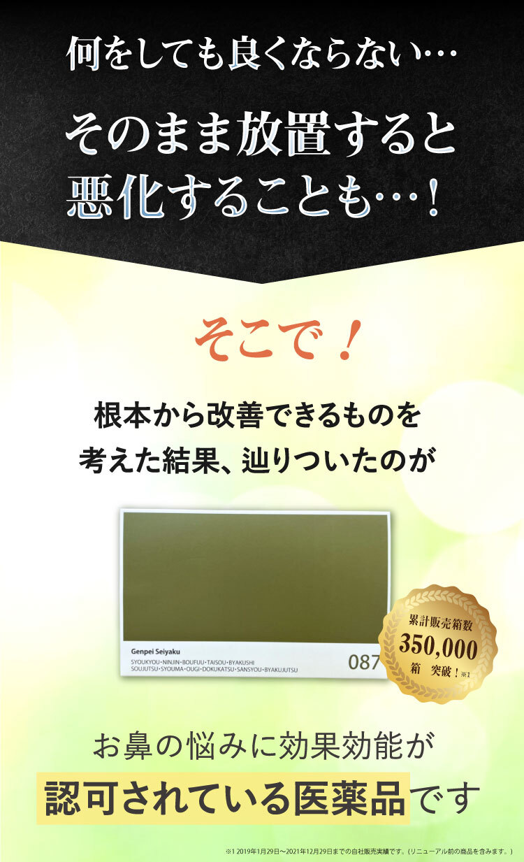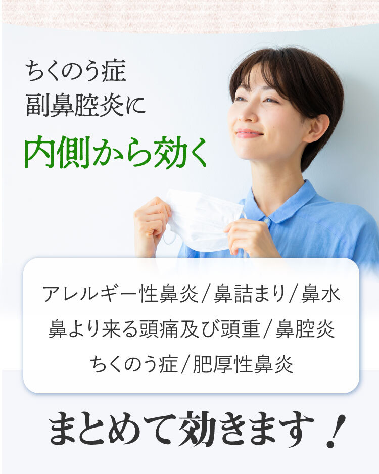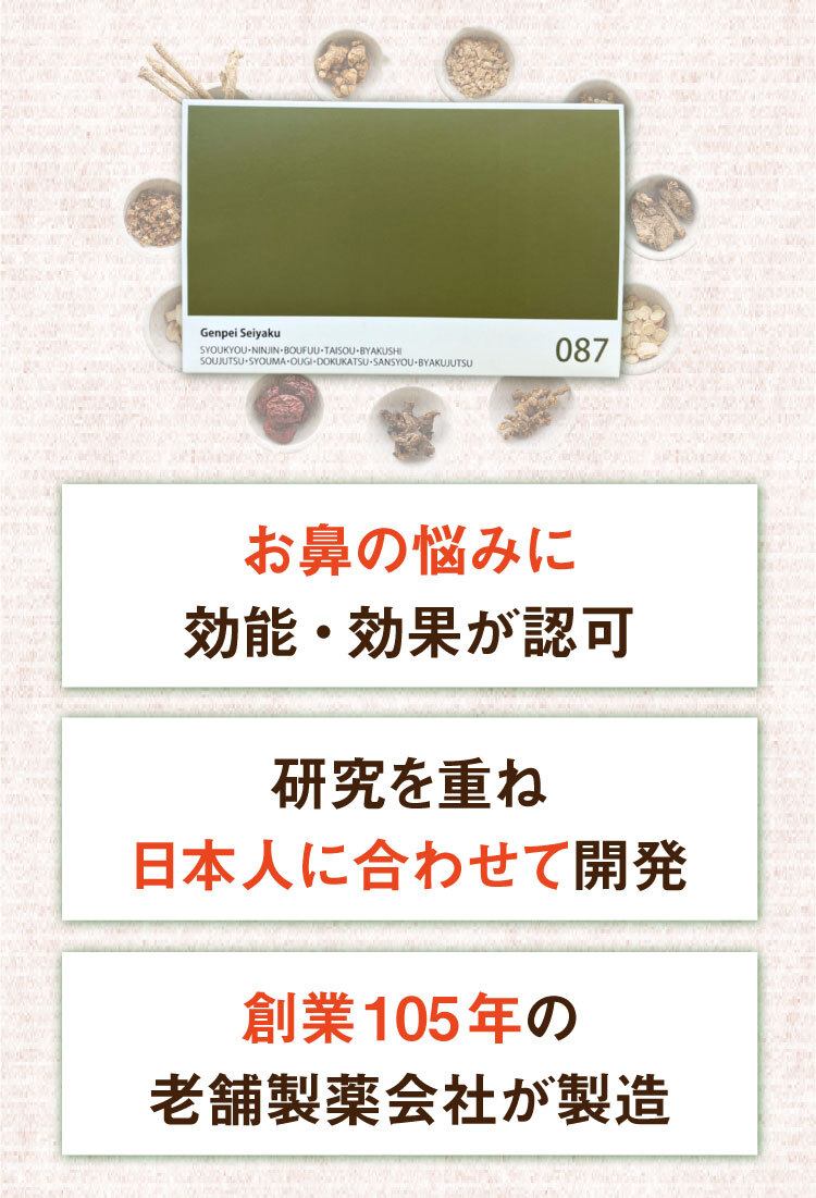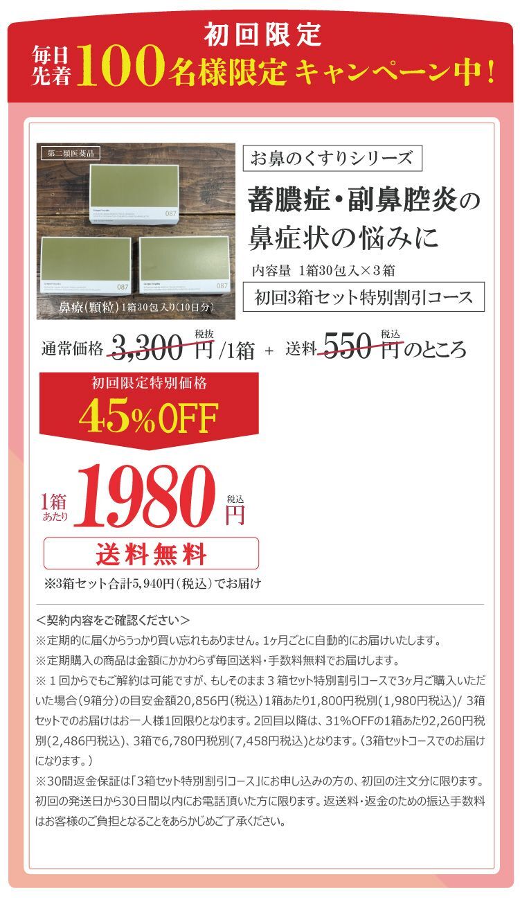 みなさまから頂くご質問、特別割引コースは1回目から解約可能ですか?はい、1回目からご解約いただけます。次回商品発送日の10日前までに解約の旨ご連絡ください。個数・コースの変更はできますか?いつでも変更いただけます。次回商品発送日の10日前までに変更内容をご連絡ください。本当に30日間返金保証してもらえるんですか?はい、大丈夫です。特別割引コースでご購入いただいたお客様が初回の発送日及び発行日を起点に30日以内に返金保証をご利用した場合、返金保証をご利用いただけます。初回以降の返品は受け付けていますか?商品の性質上、お客様のご都合による返品は原則的にお断りしています。商品到着時に必ず商品をご確認ください。・申し込まれた商品と届いた商品が異なっている場合・損傷している、汚れている商品上記に該当する場合は、無料で至急交換させていただきます。サプリメント、ハーブ・アロマ、民間療法との違いは?漢方薬は効能・効果が認められていて「改善すること」を目的としています。ハーブやアロマも一緒に考えがちですがそれらは民間療法の一つで、一定の基準における効果が証明されているものではなく、自由に利用するといったものです。また、蜂の子などの健康食品は、健康な状態を維持したり栄養を補給することを目的としています。目的に合わせ使い分けてご利用ください。漢方はずっと飲み続けないといけないのですか?いいえ、繰り返すお悩みの症状が改善されれば飲み続ける必要はありません。症状が改善し薬を飲まなくなった後でも、健康的な生活をご継続いただければ嬉しく思います。小学生ですが飲んでもいいのですか?はい、お飲みいただけます。お鼻のくすりは4歳以上の方から服用できます。但し、持病などをお持ちで他にお薬を飲んでいたりご心配な場合などありましたら、弊社医薬品相談窓口までご相談ください。急な鼻詰まりが起きたときに飲んでもいいですか?漢方薬の多くは慢性の症状に向けたものです。その場しのぎではなく、じっくりとお使いいただくお薬ですので、急に症状が出た時にのみお飲みいただくのではなく、用法用量を守って毎日服用いただければと思います。副作用はありませんか?まれに、以下のような症状があらわれる場合があります。皮膚の発疹・発赤・かゆみ・消化器の食欲不振・胃部不快感、このような症状が出た場合にはいったん服用をお止めいただき、弊社医薬品相談窓口、またはかかりつけの医師にご相談ください。もともと胃の弱い方は、少量で様子を見ながら始めたほうが良い場合などもあります。そのため、服用前には必ず添付文書をお読みください。鼻詰まりの症状が一時的なものですが、飲んで大丈夫ですか?はい、お飲みいただいて大丈夫です。その他にも服用の際にご心配なことがございましたら弊社医薬品相談窓口へお気軽にご相談ください。フリマサイトで見かけたのですが、そちらで購入してもいいですか?こちらは医薬品です。医薬品を販売するには、医薬品販売業の許可が必要で、許可なく医薬品をフリマサイト等で販売することは、医薬品医療機器等法に違反します。その旨理解されていない方が転売している可能性がありますので、購入しないようお願い致します。購入の際は、こちらの公式ページからのお申込み・フリーダイヤルよりお待ちしております。