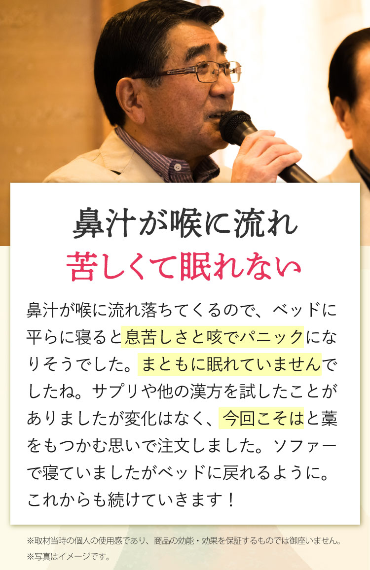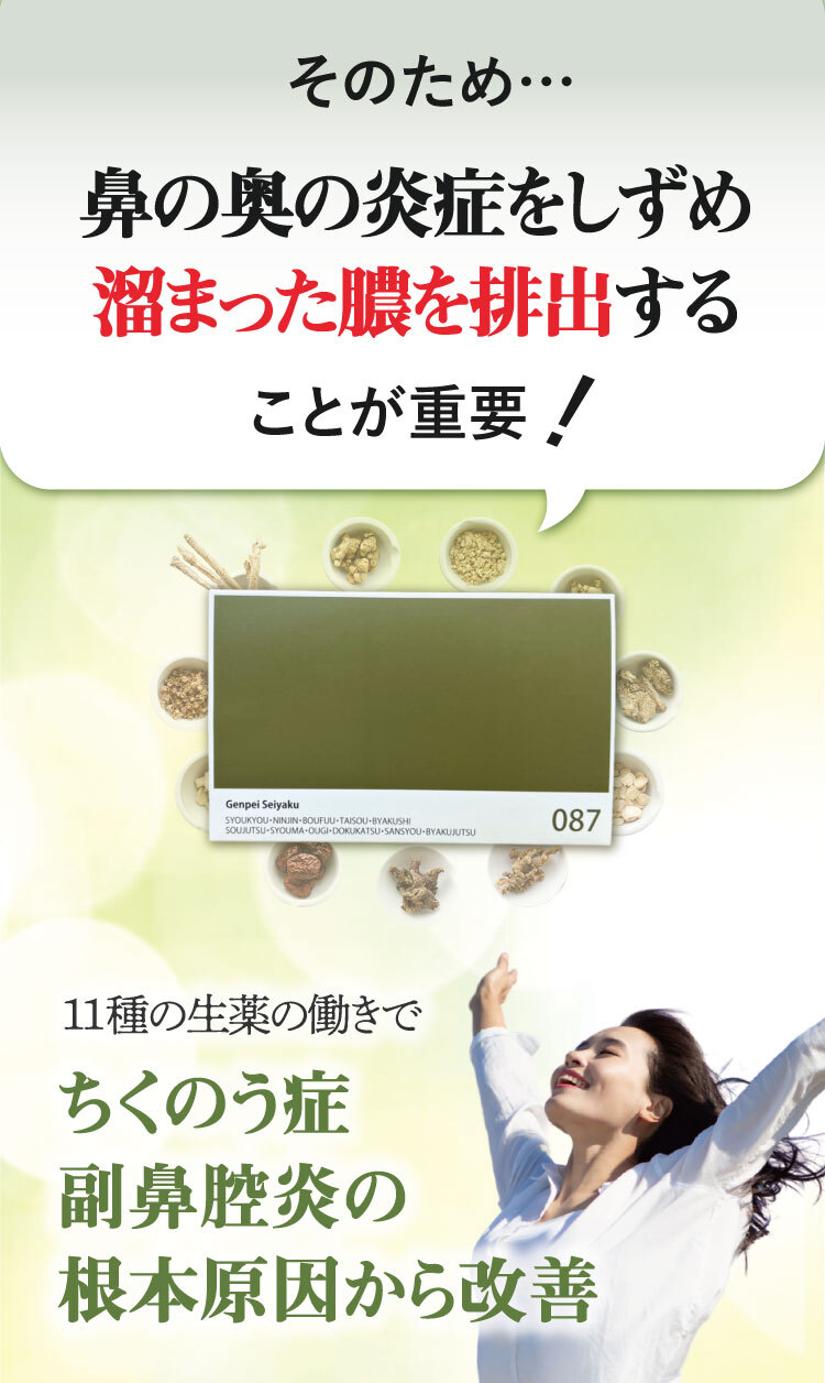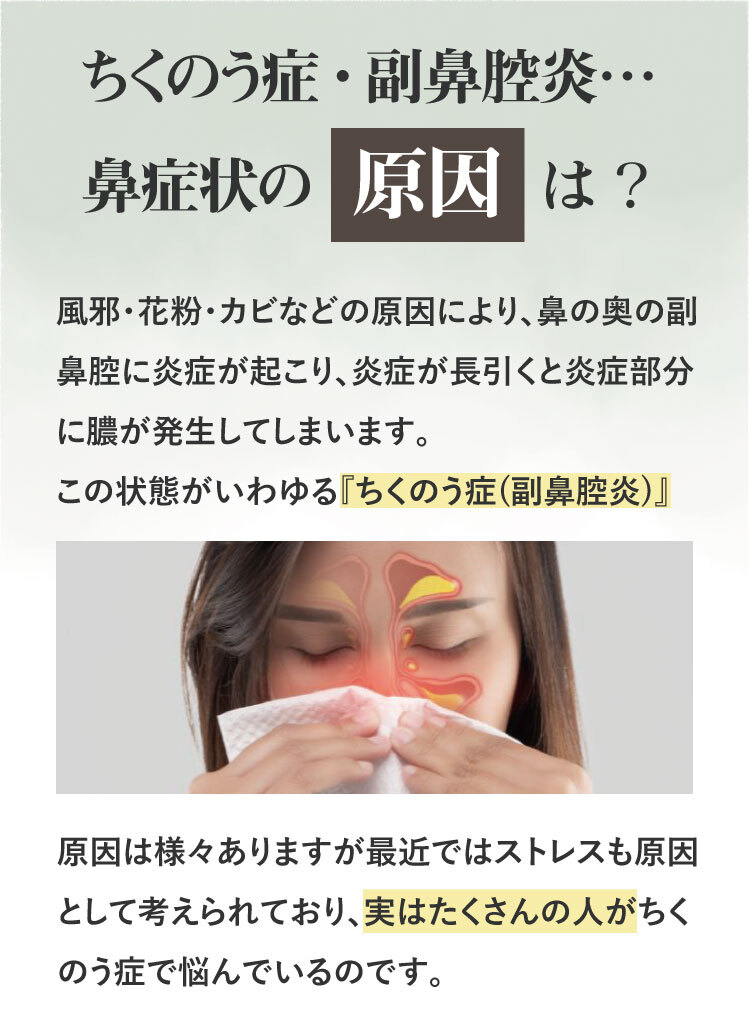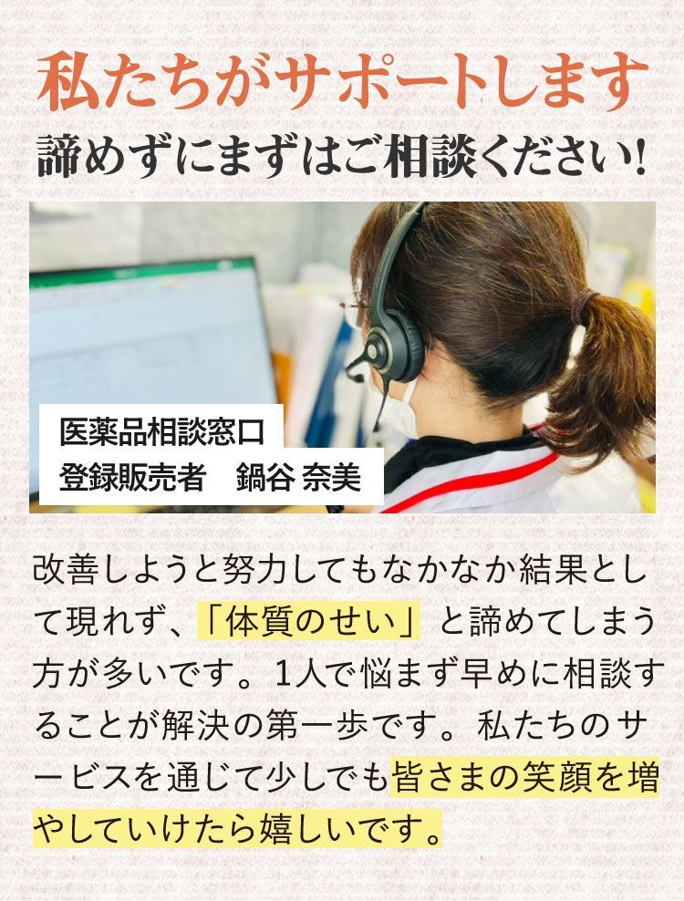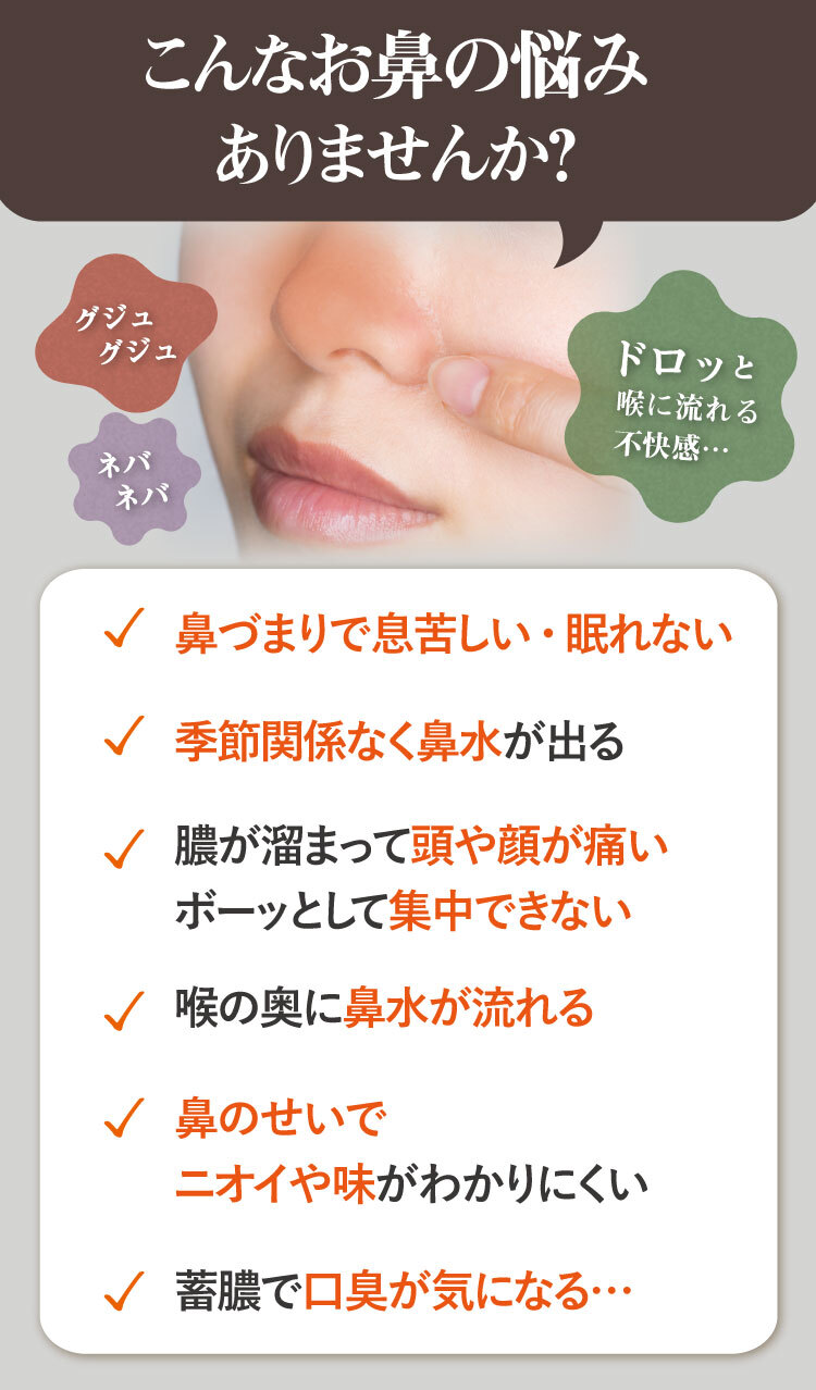 みなさまから頂くご質問、特別割引コースは1回目から解約可能ですか?はい、1回目からご解約いただけます。次回商品発送日の10日前までに解約の旨ご連絡ください。個数・コースの変更はできますか?いつでも変更いただけます。次回商品発送日の10日前までに変更内容をご連絡ください。本当に30日間返金保証してもらえるんですか?はい、大丈夫です。特別割引コースでご購入いただいたお客様が初回の発送日及び発行日を起点に30日以内に返金保証をご利用した場合、返金保証をご利用いただけます。初回以降の返品は受け付けていますか?商品の性質上、お客様のご都合による返品は原則的にお断りしています。商品到着時に必ず商品をご確認ください。・申し込まれた商品と届いた商品が異なっている場合・損傷している、汚れている商品上記に該当する場合は、無料で至急交換させていただきます。サプリメント、ハーブ・アロマ、民間療法との違いは?漢方薬は効能・効果が認められていて「改善すること」を目的としています。ハーブやアロマも一緒に考えがちですがそれらは民間療法の一つで、一定の基準における効果が証明されているものではなく、自由に利用するといったものです。また、蜂の子などの健康食品は、健康な状態を維持したり栄養を補給することを目的としています。目的に合わせ使い分けてご利用ください。漢方はずっと飲み続けないといけないのですか?いいえ、繰り返すお悩みの症状が改善されれば飲み続ける必要はありません。症状が改善し薬を飲まなくなった後でも、健康的な生活をご継続いただければ嬉しく思います。小学生ですが飲んでもいいのですか?はい、お飲みいただけます。お鼻のくすりは4歳以上の方から服用できます。但し、持病などをお持ちで他にお薬を飲んでいたりご心配な場合などありましたら、弊社医薬品相談窓口までご相談ください。急な鼻詰まりが起きたときに飲んでもいいですか?漢方薬の多くは慢性の症状に向けたものです。その場しのぎではなく、じっくりとお使いいただくお薬ですので、急に症状が出た時にのみお飲みいただくのではなく、用法用量を守って毎日服用いただければと思います。副作用はありませんか?まれに、以下のような症状があらわれる場合があります。皮膚の発疹・発赤・かゆみ・消化器の食欲不振・胃部不快感、このような症状が出た場合にはいったん服用をお止めいただき、弊社医薬品相談窓口、またはかかりつけの医師にご相談ください。もともと胃の弱い方は、少量で様子を見ながら始めたほうが良い場合などもあります。そのため、服用前には必ず添付文書をお読みください。鼻詰まりの症状が一時的なものですが、飲んで大丈夫ですか?はい、お飲みいただいて大丈夫です。その他にも服用の際にご心配なことがございましたら弊社医薬品相談窓口へお気軽にご相談ください。フリマサイトで見かけたのですが、そちらで購入してもいいですか?こちらは医薬品です。医薬品を販売するには、医薬品販売業の許可が必要で、許可なく医薬品をフリマサイト等で販売することは、医薬品医療機器等法に違反します。その旨理解されていない方が転売している可能性がありますので、購入しないようお願い致します。購入の際は、こちらの公式ページからのお申込み・フリーダイヤルよりお待ちしております。