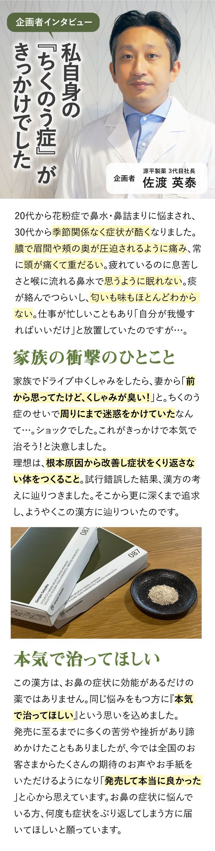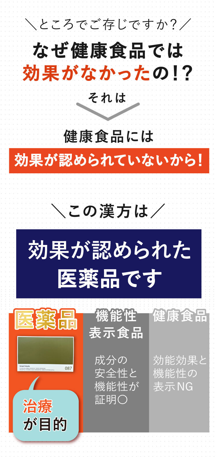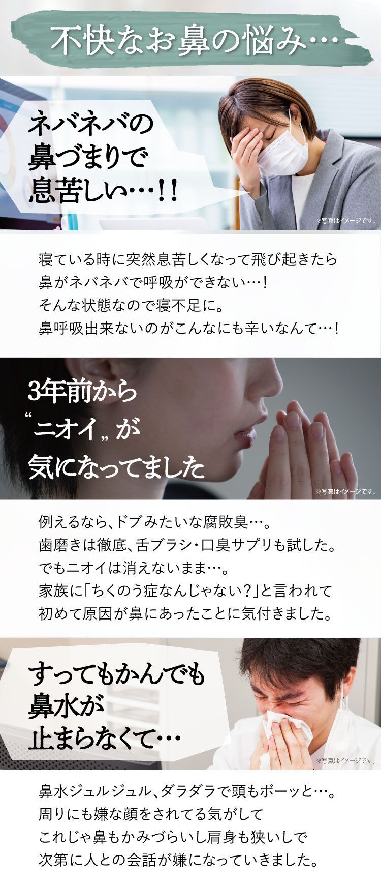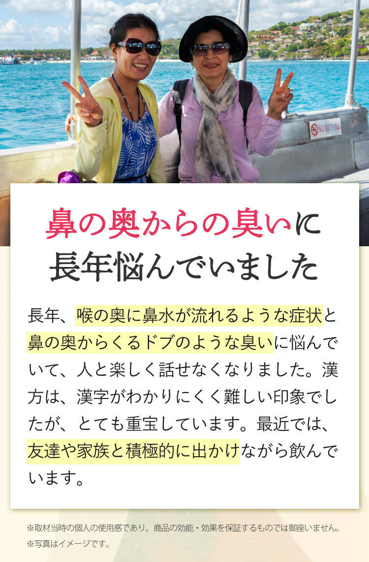 みなさまから頂くご質問、特別割引コースは1回目から解約可能ですか?はい、1回目からご解約いただけます。次回商品発送日の10日前までに解約の旨ご連絡ください。個数・コースの変更はできますか?いつでも変更いただけます。次回商品発送日の10日前までに変更内容をご連絡ください。本当に30日間返金保証してもらえるんですか?はい、大丈夫です。特別割引コースでご購入いただいたお客様が初回の発送日及び発行日を起点に30日以内に返金保証をご利用した場合、返金保証をご利用いただけます。初回以降の返品は受け付けていますか?商品の性質上、お客様のご都合による返品は原則的にお断りしています。商品到着時に必ず商品をご確認ください。・申し込まれた商品と届いた商品が異なっている場合・損傷している、汚れている商品上記に該当する場合は、無料で至急交換させていただきます。サプリメント、ハーブ・アロマ、民間療法との違いは?漢方薬は効能・効果が認められていて「改善すること」を目的としています。ハーブやアロマも一緒に考えがちですがそれらは民間療法の一つで、一定の基準における効果が証明されているものではなく、自由に利用するといったものです。また、蜂の子などの健康食品は、健康な状態を維持したり栄養を補給することを目的としています。目的に合わせ使い分けてご利用ください。漢方はずっと飲み続けないといけないのですか?いいえ、繰り返すお悩みの症状が改善されれば飲み続ける必要はありません。症状が改善し薬を飲まなくなった後でも、健康的な生活をご継続いただければ嬉しく思います。小学生ですが飲んでもいいのですか?はい、お飲みいただけます。お鼻のくすりは4歳以上の方から服用できます。但し、持病などをお持ちで他にお薬を飲んでいたりご心配な場合などありましたら、弊社医薬品相談窓口までご相談ください。急な鼻詰まりが起きたときに飲んでもいいですか?漢方薬の多くは慢性の症状に向けたものです。その場しのぎではなく、じっくりとお使いいただくお薬ですので、急に症状が出た時にのみお飲みいただくのではなく、用法用量を守って毎日服用いただければと思います。副作用はありませんか?まれに、以下のような症状があらわれる場合があります。皮膚の発疹・発赤・かゆみ・消化器の食欲不振・胃部不快感、このような症状が出た場合にはいったん服用をお止めいただき、弊社医薬品相談窓口、またはかかりつけの医師にご相談ください。もともと胃の弱い方は、少量で様子を見ながら始めたほうが良い場合などもあります。そのため、服用前には必ず添付文書をお読みください。鼻詰まりの症状が一時的なものですが、飲んで大丈夫ですか?はい、お飲みいただいて大丈夫です。その他にも服用の際にご心配なことがございましたら弊社医薬品相談窓口へお気軽にご相談ください。フリマサイトで見かけたのですが、そちらで購入してもいいですか?こちらは医薬品です。医薬品を販売するには、医薬品販売業の許可が必要で、許可なく医薬品をフリマサイト等で販売することは、医薬品医療機器等法に違反します。その旨理解されていない方が転売している可能性がありますので、購入しないようお願い致します。購入の際は、こちらの公式ページからのお申込み・フリーダイヤルよりお待ちしております。
